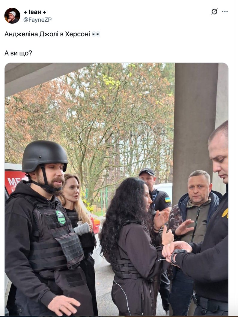 “New photos of American actress Angelina Jolie in Ukraine have appeared on social media — reportedly, she visited Kherson”, - Suspilne reported on November 5.