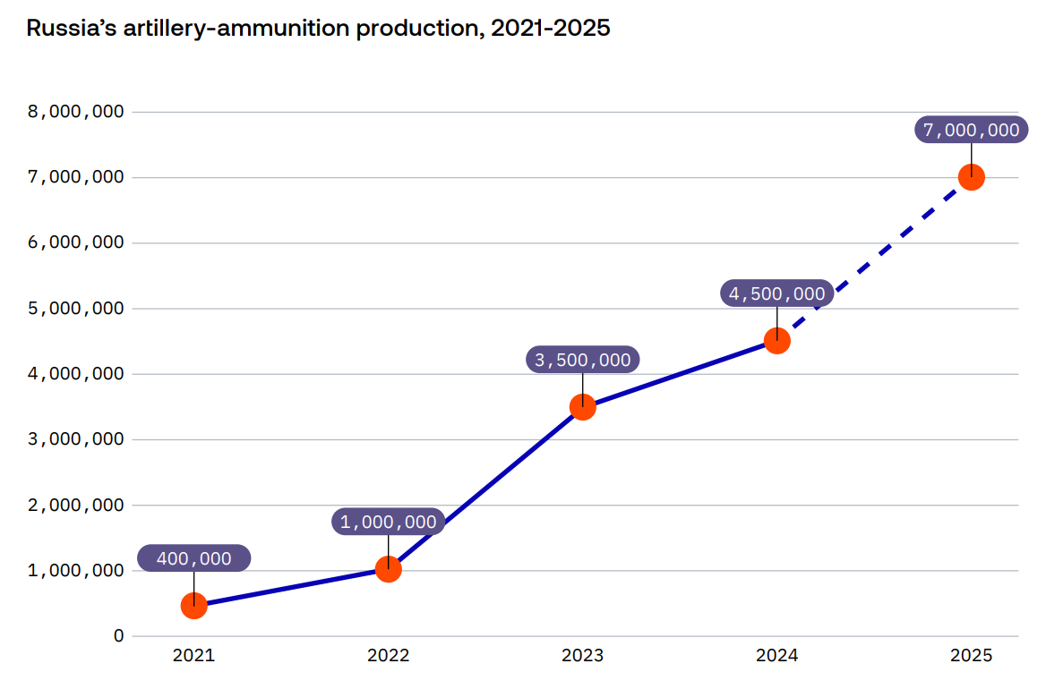 The production structure in 2025 looked as follows: howitzer ammunition (122 mm, 152 mm, and 203 mm) — 3.4 million; mortar rounds (120 mm and 240 mm) — 2.3 million; ammunition for tanks and infantry fighting vehicles — 0.8 million; rockets for MLRS — 0.5 million.