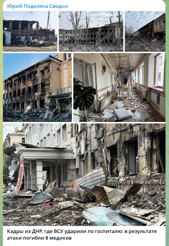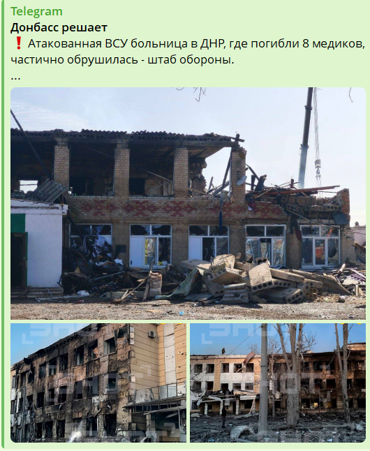The fact is that two medical institutions in Donetsk were indeed damaged as a result of a strike by the AFU, but they were not damaged by drone strikes, rather due to a detonation at a large weapons depot of the russians located in the residential area of the city. And this happened not on March 10, but on March 8. This is what Donetsk media wrote at the time: “On International Women’s Day they struck civilian objects in the Kyivskyi district of the DNR capital, as a result of which three civilians were wounded and more than 10 civilian objects were damaged. One of these objects turned out to be a children’s hospital, which, fortunately, was closed for repairs at that moment…”; “The glazing of a nearby clinic was also damaged”. That is, there was not even any mention of dead medical staff.