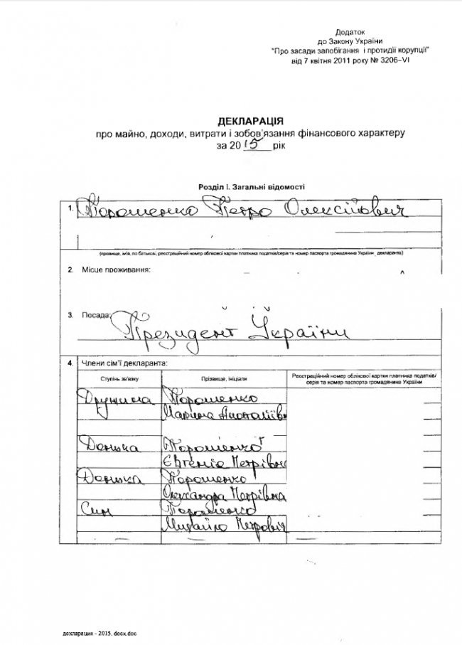 President Petro Poroshenko declared 62,162,819 hryvnia income in 2015. This is stated in his declarationof income, expenses and financial obligations for 2015 which was posted on the website of the President.